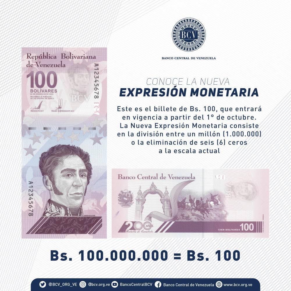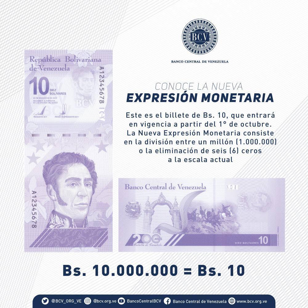 A través de un comunicado, el BCV informó que a partir del 1ero de octubre entrará en vigencia el “Bolívar Digital” y serán suprimidos seis ceros a la moneda nacional y que todo importe monetario y expresado en moneda nacional, se dividirá entre un millón (1.000.000).