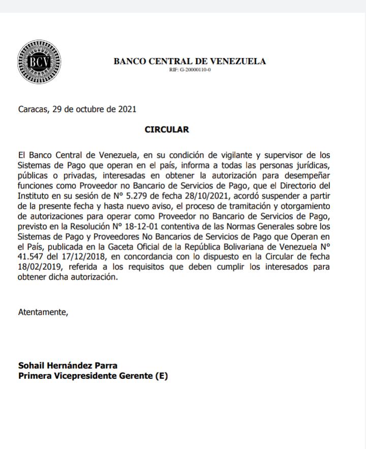 «El Banco Central de Venezuela, en su condición de vigilante y supervisor de los Sistemas de Pago que operan en el país, informa a todas las personas jurídicas, públicas o privadas, interesadas en obtener la autorización para desempeñar funciones como Proveedor no Bancario de Servicios de Pago, que el Directorio del Instituto en su sesión de N° 5.279 de fecha 28/10/2021, acordó suspender a partir de la presente fecha y hasta nuevo aviso, el proceso de tramitación y otorgamiento de autorizaciones para operar como Proveedor no Bancario de Servicios de Pago», señala el texto íntegro de la circular.