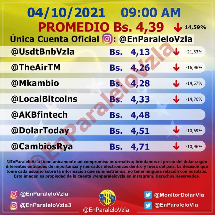 El dólar paralelo sigue con la tendencia a la baja la mañana de este 4 de octubre al cotizarse en Bs. 4,39 o lo que era 4.390.000.