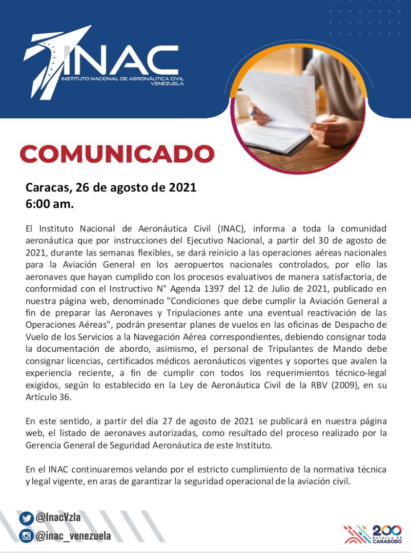 “El INAC, informa a toda la comunidad aeronáutica que, por instrucciones del Ejecutivo Nacional, a partir del 30 de agosto de 2021, durante las semanas flexibles, se dará reinicio a las operaciones aéreas nacionales para la Aviación General”, publicaron de su cuenta en Twitter.