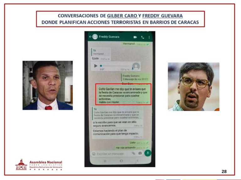 Entre los contactos que mantenía López para la organización de estas acciones delincuenciales estaban Freddy Guevara y Luis Somaza quienes eran los encargados junto a Gilber Caro y Hasler Iglesias de “últimar los detalles” para llevar a cabo esta operación que denominaron como la “Fiesta de Caracas”.