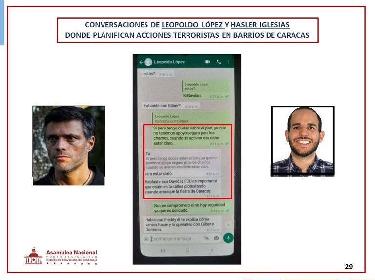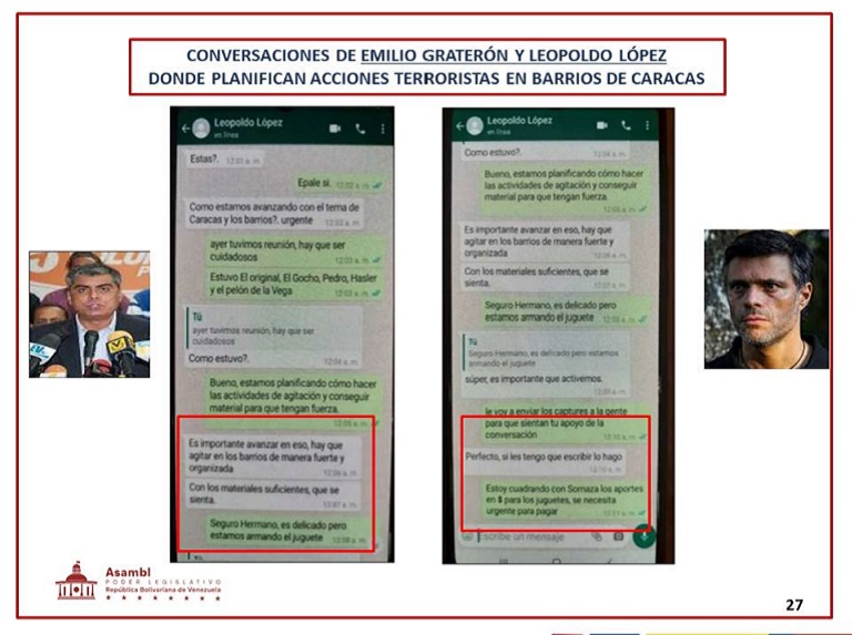 En rueda de prensa ofrecida desde el Palacio Federal Legislativo, el jefe del parlamento mostró una serie de mensajes WhatsApp donde Leopoldo López bajo el alias de “Gavilán”, organizaba las acciones criminales que llevarían a cabo estas bandas apostadas en las barriadas de la Cota 905 y el Cemeterio.