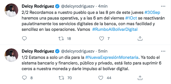 "Estamos a solo un día para la nueva expresión monetaria. Ya todo el sistema bancario y financiero, público y privado; está listo para suprimir seis ceros a nuestra moneda y darle impulso al bolívar digital", indicó en su cuenta en Twitter.