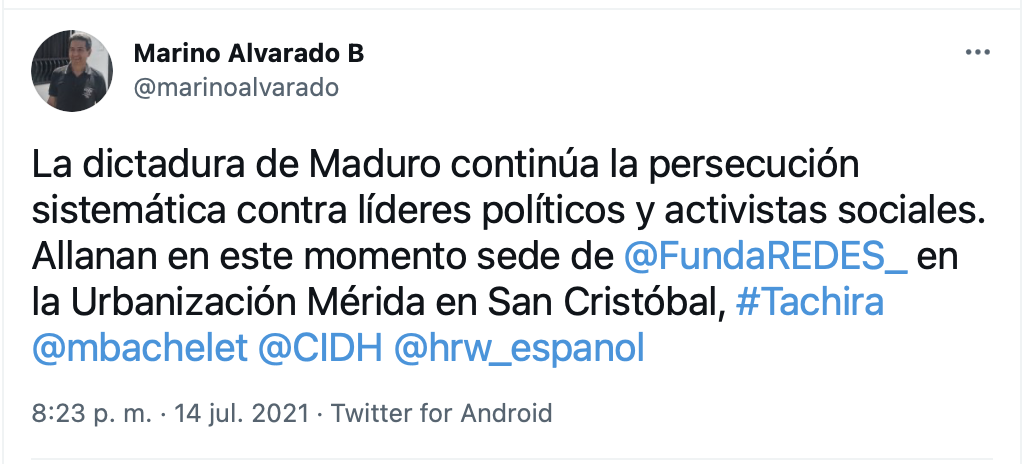 La madrugada de este miércoles la policía hostigó a los padres del dirigente Luis Somaza, también acusado por Jorge Rodríguez de supuestos vínculos con las bandas de la Cota 905. Luego en la tarde detuvieron sin orden judicial a María Coromoto González, madre del dirigente Javier González “El gocho”, otro acusado por Rodríguez. También se llevaron a su hermano, Michael González, y a su primo, Michel González, porque a él no lo consiguieron. Además, una comisión conjunta del Sebin y Dgcim, detuvo al dirigente social de La Vega, Jairo Pérez. En marzo fue detenido 5 horas por protestar la escasez de agua. Esta noche allanaron la sede de FundaRedes, la casa de su director preso y desaparecido, Javier Tarazona, y la de la madre de Tarazona. FundaRedes denunció que el Sebin puede ‘sembrar falsas evidencias’.