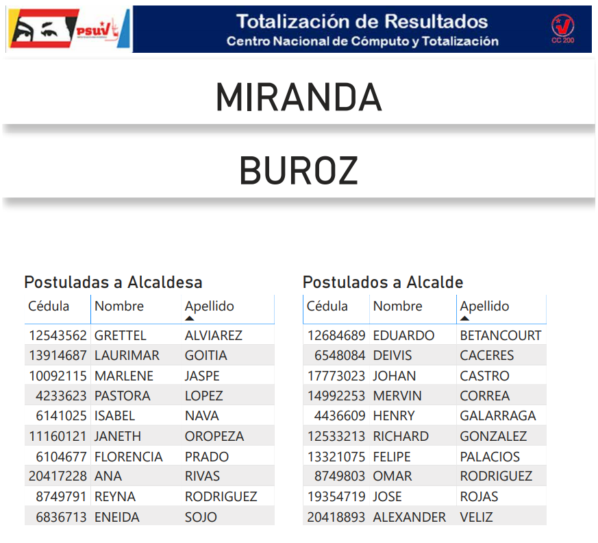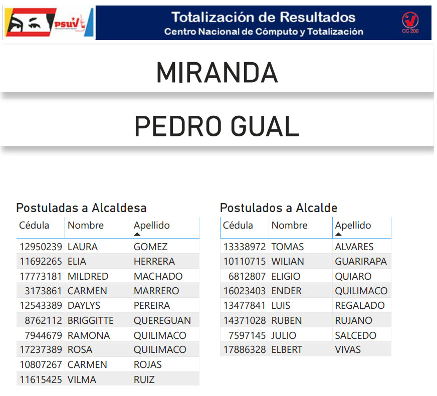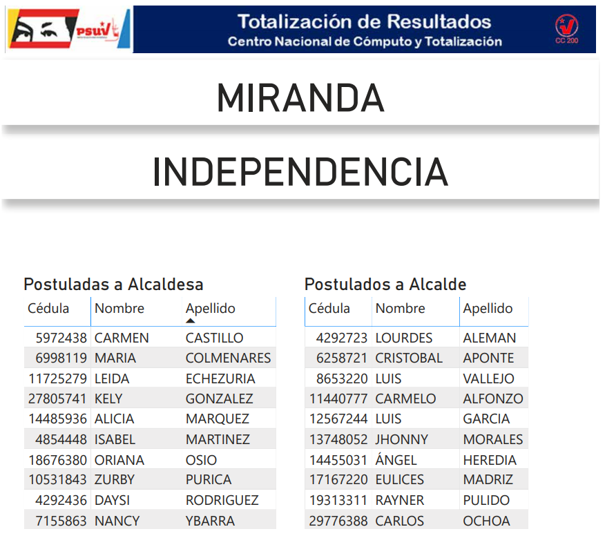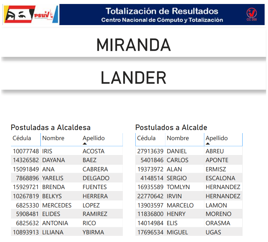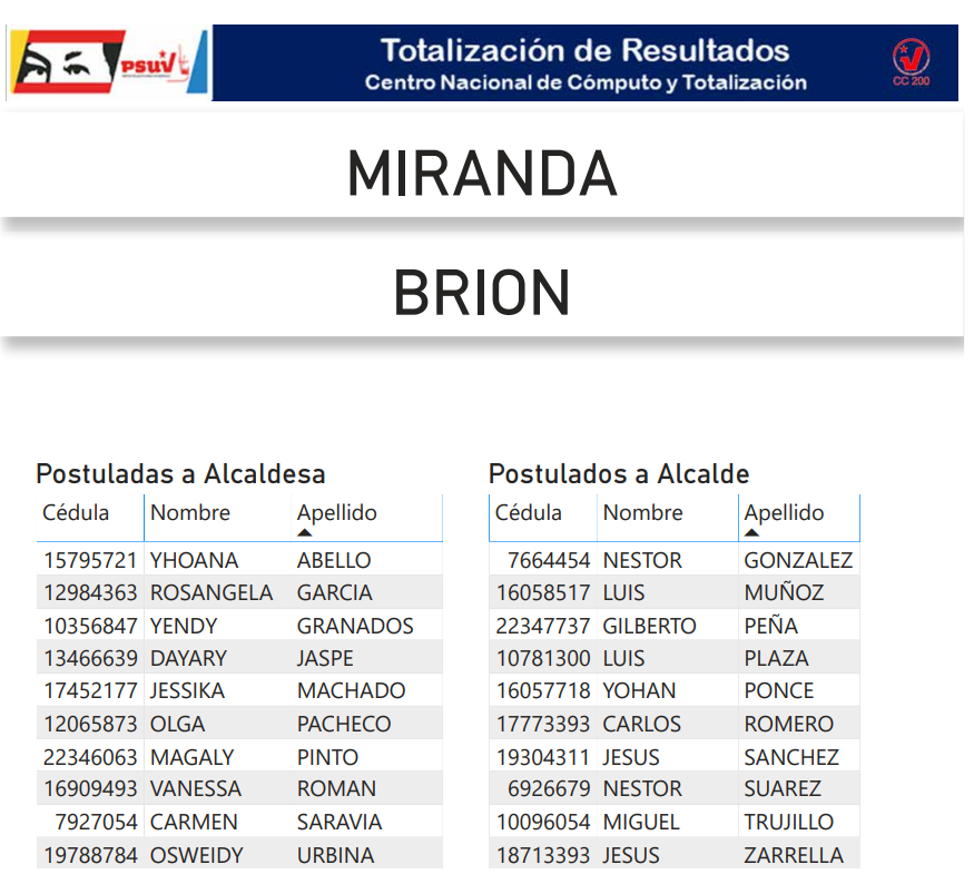 A continuación, presentamos a toda la militancia psuvista los resultados del proceso de postulación de candidatas y candidatos de esta organización política a las alcaldías del estado Miranda.