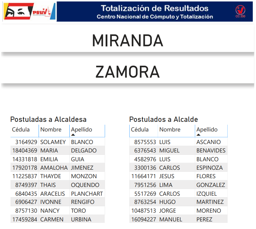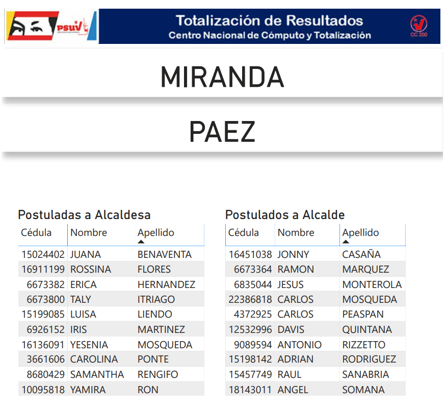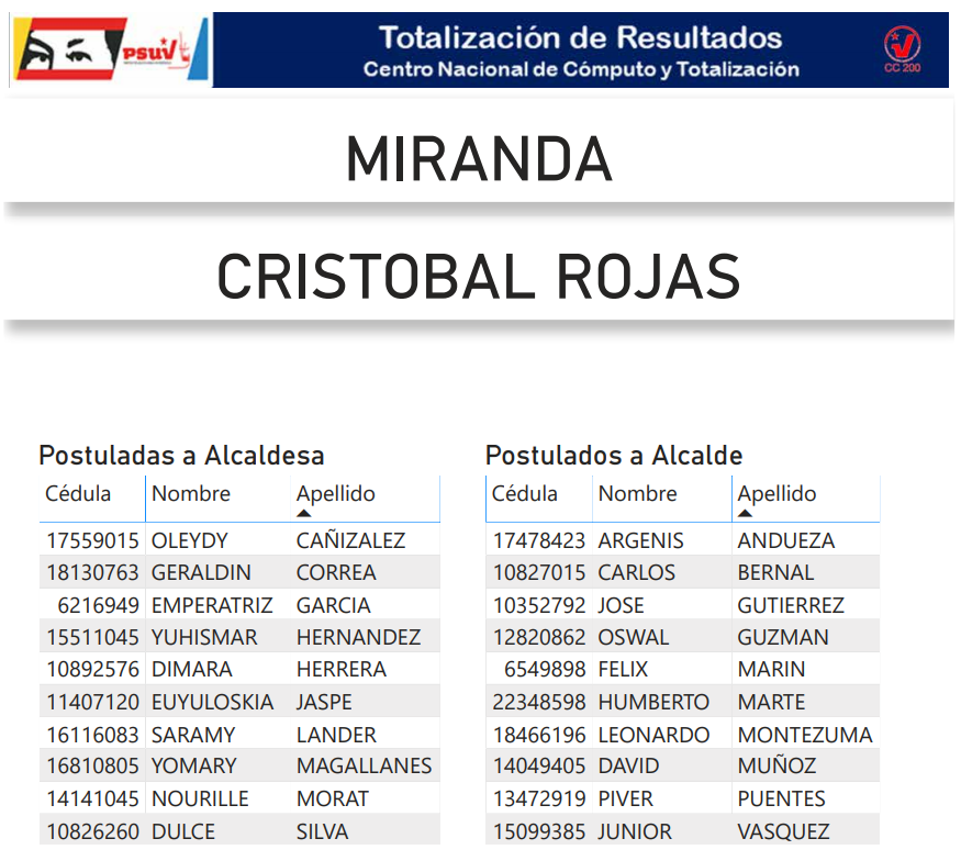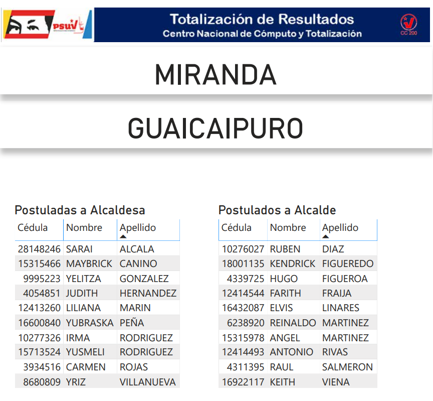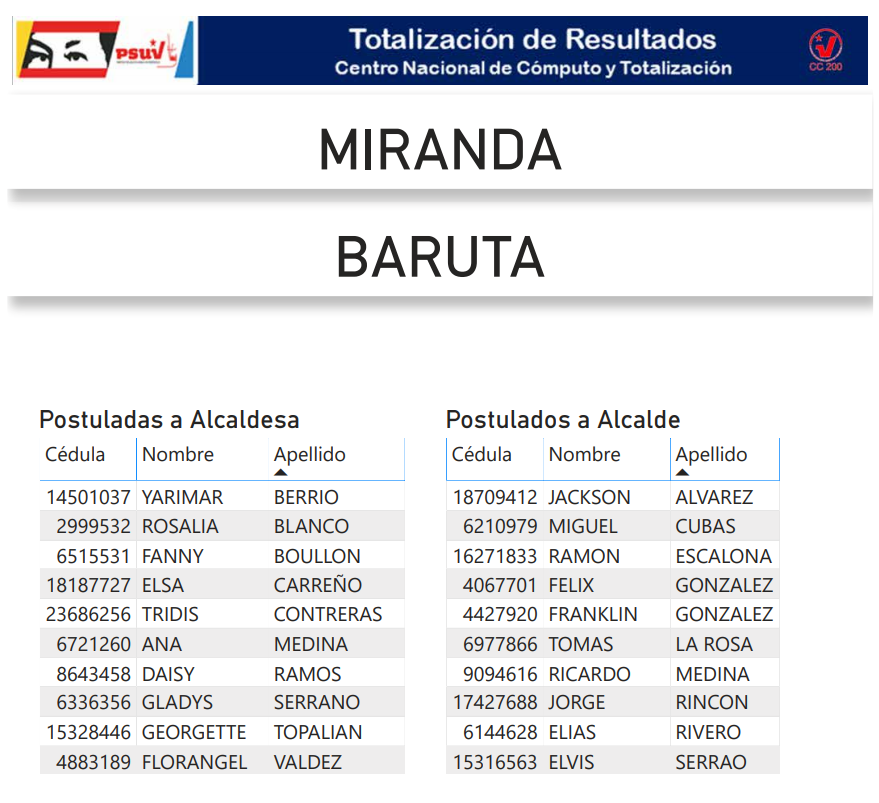 A continuación, presentamos a toda la militancia psuvista los resultados del proceso de postulación de candidatas y candidatos de esta organización política a las alcaldías del estado Miranda.