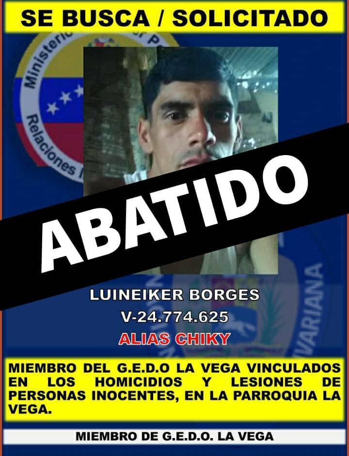 Uno de los muertos tras enfrentarse a comisiones de las Faes en La Cota 905 de la Policía Nacional Bolivariana (PNB) fue identificado como Luineiker Borges, alias "Chiky". Operativos policiales continúan para dar con el paradero de Koki, Garbis, Vampi, Loco Leo y el resto de los integrantes de la banda que andan en fuga. Se espera que en las próximas hora se presente un balance con las cifras oficiales.